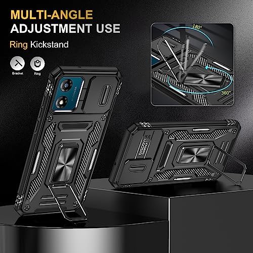 for Motorola Moto E13 Case with 2 Screen Protectors,Built-in Slide Camera Cover+360° Kickstand Ring for E13 Phone Case Shockproof Anti-Scratch Military-Grade Drop Heavy Duty Protection Black