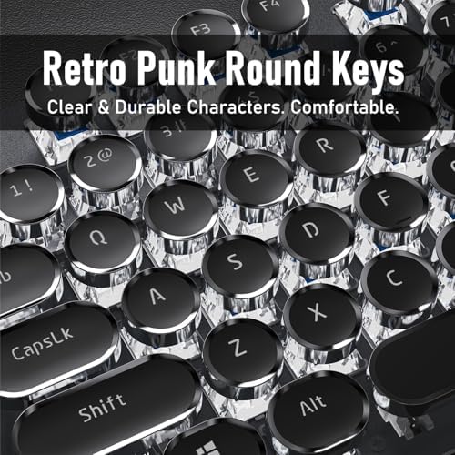 - Retro Typewriter Style Round Keycaps: The TK100 wired typewriter keyboard uses a double-shot injection retro punk round keycap with a clear backlight, which is extremely durable. Stepped floating keycaps that fit your fingertips perfectly, a precise position. Ergonomic foot support makes typing less tiring and more comfortable. The highly durable mechanical blue switch responds faster and more quickly, accompanied by a crisp click