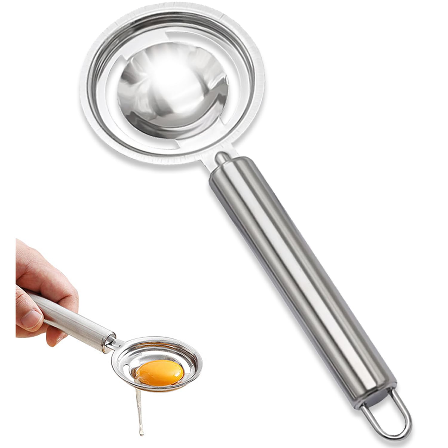 - Easy To Use, Easy To Separate: There are three filter holes on the bottom side of the egg separator. When the eggs are cracked, the egg white and yolk are separated quickly without having to shake the egg separator, saving you precious time. There is a slot at the bottom of the egg separator handle, which is convenient for use in bowls of different sizes.
