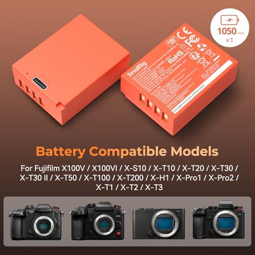 - Replacement Battery for Fujifilm NP-W126S: This SmallRig battery is suitable for Fujifilm X100VI, X-E5, X-M5, X Half,X100V, X-S10, X-T10, X-T20, X-T30, X-T30 II, X-T50, X-T100, X-T200, X-H1, X-Pro1, X-Pro2, X-T1, X-T2, X-T3. Fully decoded battery, you don't need to worry about the warning pop-up that the battery will damage the camera.
