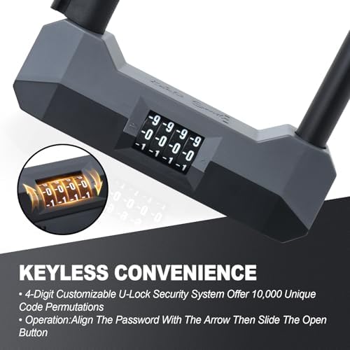 - Easy to Set & Use: This heavy-duty bike lock is designed for simplicity. Locking and unlocking is quick and hassle-free, and installation on your bike is a breeze. The secure connection to the bike frame is achieved with a simple button release, ensuring smooth operation. It comes with 2 keys, allowing you to reset the 4-digit code to whatever you prefer. Whether you need a lock for bike or a u lock bike solution, this lock delivers both ease and reliability