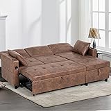 Lesofair 84" L-Shape Pull Out Sofa Bed with Adjustable Backrest, Upholstered Sectional Sleeper Sofa with Storage Chaise, Suede Leather Reversible Couch Bed with USB Port for Living Room, House, Brown