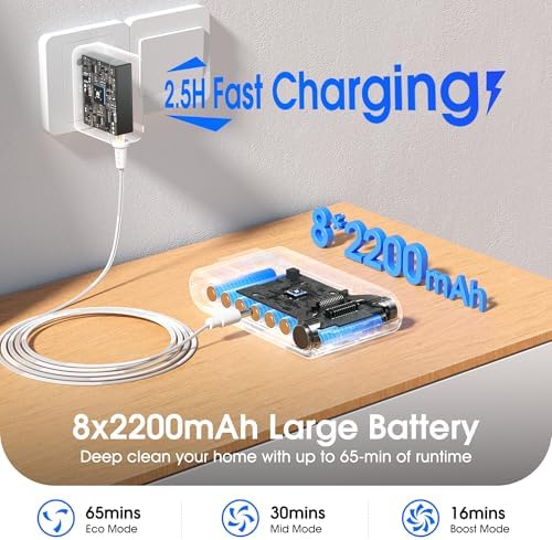 - Extended Runtime for Big Jobs – With fast charging, it fully recharges in ONLY 2.5 hours(Charger Included). Its upgraded 176,000mAh 8-cell battery delivers up to 65 minutes of continuous cleaning in ECO mode, reducing mid-task interruptions so you can cover more ground with fewer breaks.(16 mins in BOOST mode; 30 mins in MID mode; 65 mins in ECO mode)