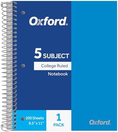 These Oxford 5-Subject Poly Cover Notebooks are perfect for school, home, or office. Poly covers resist water, wear, and tear, so your writing notebooks last longer. The 8.5" x 11" size is ideal for taking class notes, journaling, jotting down to-do lists, or writing your next big project. Each notebook features 4 double-sided storage pockets for loose sheets, extra paper, or notes. Sheets are perforated, making it easy to tear out pages with no messy edges. Also, these notebooks are 3-hole punched so that their pages can be easily inserted into a 3-ring binder. This durable five-subject notebook comes in blue and is wire-bound to prevent snags and make page-turning easy. You'll get 1 college-rule notebook with 200 sheets, offering plenty of writing space. Detached sheets measure 8" x 11". Single notebook comes in blue.