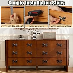 Widely Applications : Whether used to replace old handles or to fit on a new cabinet, this bow drawer knobs gives furniture cabinets a new look, perfect for doors for any purpose such as drawer door, wardrobe door, cabinet door, cupboard door, also for cabinet dresser drawers cupboard wardrobe bookcase Quality Materials : This black bow drawer knob is made of solid zinc alloy, carefully polished, resistant to deformation or breakage, can be used for a long time. Suitable for a wide range of environments Product Features : Wide range of uses Beautiful and generous,Unique black bow knobs shape in line with modern aesthetic standards. Decorative bow handles has a smooth surface, no sharp edges, it is very attractive and suitable for any style of furniture. This bow decor is a perfect choice for decorating your home Products Include : You will receive 4 bow knobs for dresser and 4 mounting screws. It is very suitable for replacing damaged handles on existing cabinets, giving your furniture a new look instantly Easy to Install : Find the position where you want to install cabinet pull and drill a hole, then pass through the screw from the back of board and thread tight to the gold drawer knobs. We provide you with 4 pcs screws to make your installation more convenient