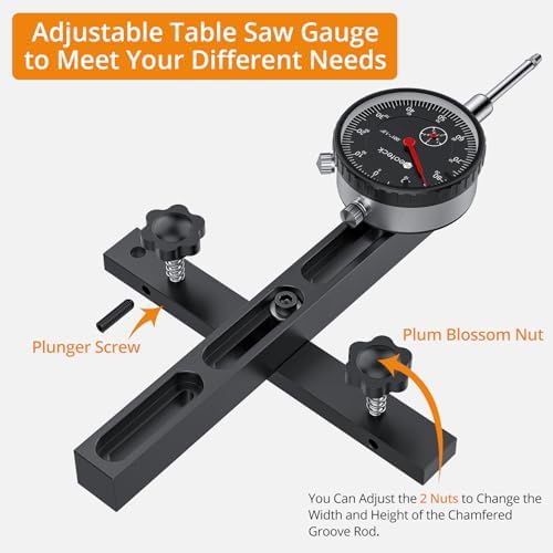- 【Professional Dial Indicator Table Saw Gauge】Neoteck table saw calibrator is a precision tool designed to fit the standard miter slot size (3/8" x 3/4"), allowing you to assess your table saw's alignment and positioning. This dial indicator gauge can identify arbor and blade run-out, miter slot to blade squareness, arbor/chuck run-out, or any other alignment measurements you require. It is commonly used in calibration work, shop machinery, band saws, and drilling machines