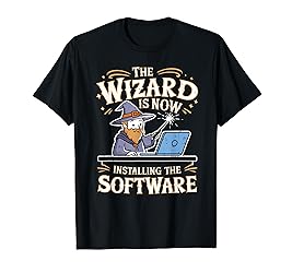 A funny Wizard Installing Software design, makes a perfect funny Humor gift for IT Programmer Geek, Nerd, Computer Engineer Gamer or Coding Coder. Lightweight, Classic fit, Double-needle sleeve and bottom hem