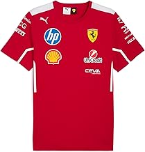 The official 2025 Scuderia Ferrari Team T-shirt from PUMA, recognisable as being worn throughout the 2025 Formula 1 season by the team and drivers Lewis and Charles. Team T-shirt with round neck collar and short sleeves, in Ferrari's 2025 Scuderia red with all the official Ferrari and PUMA branding.