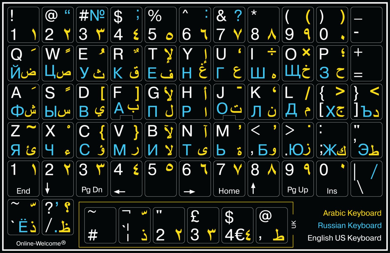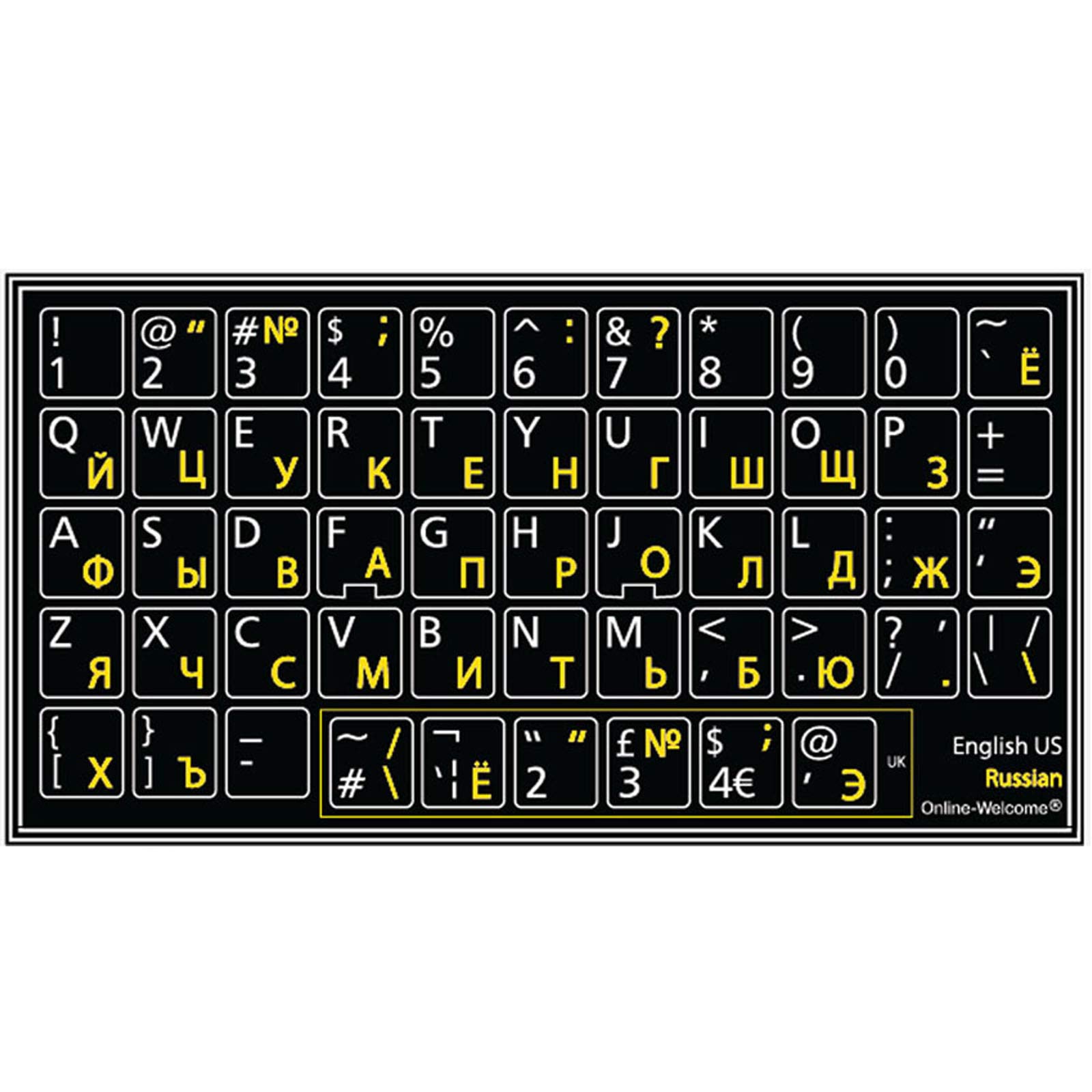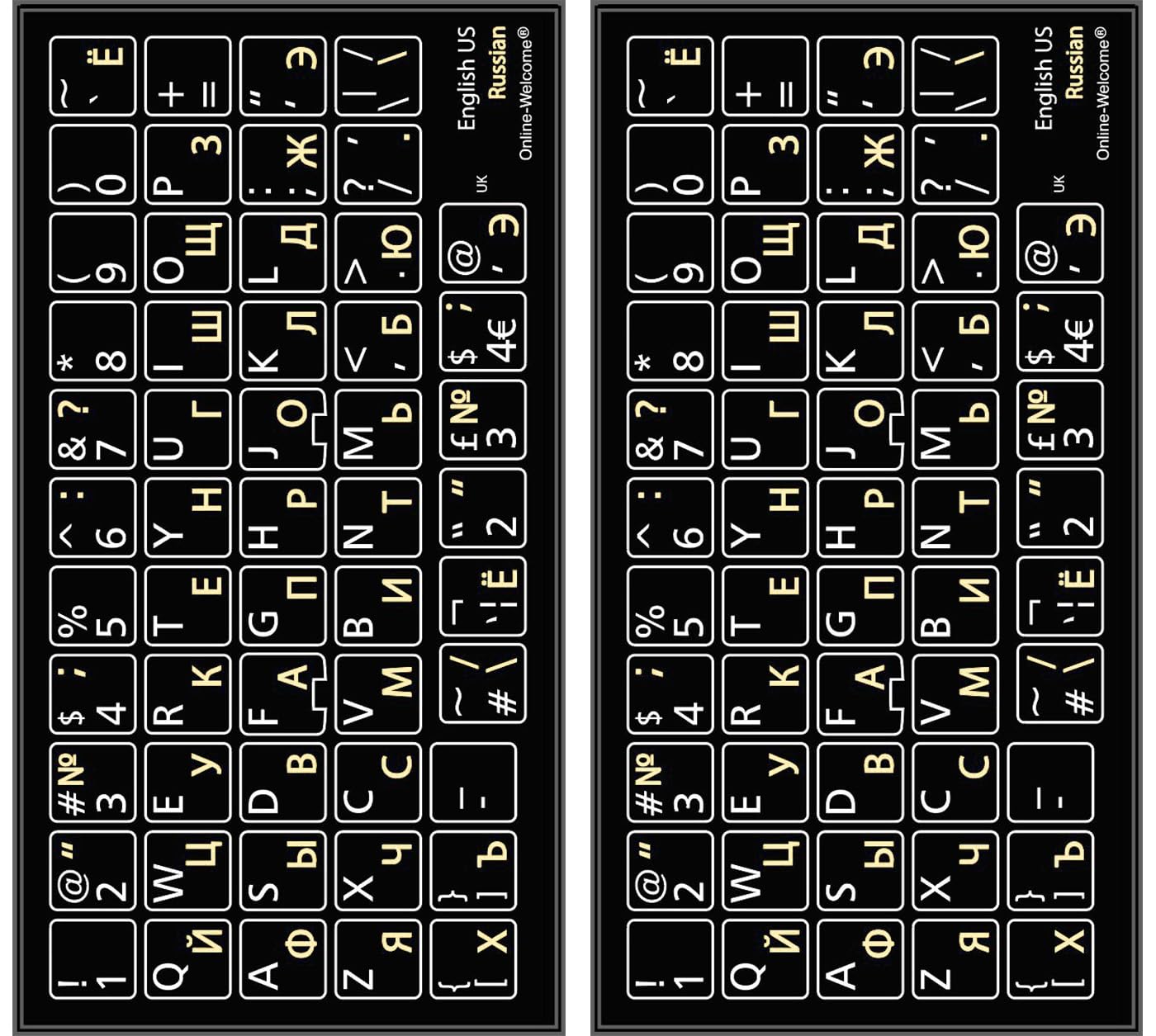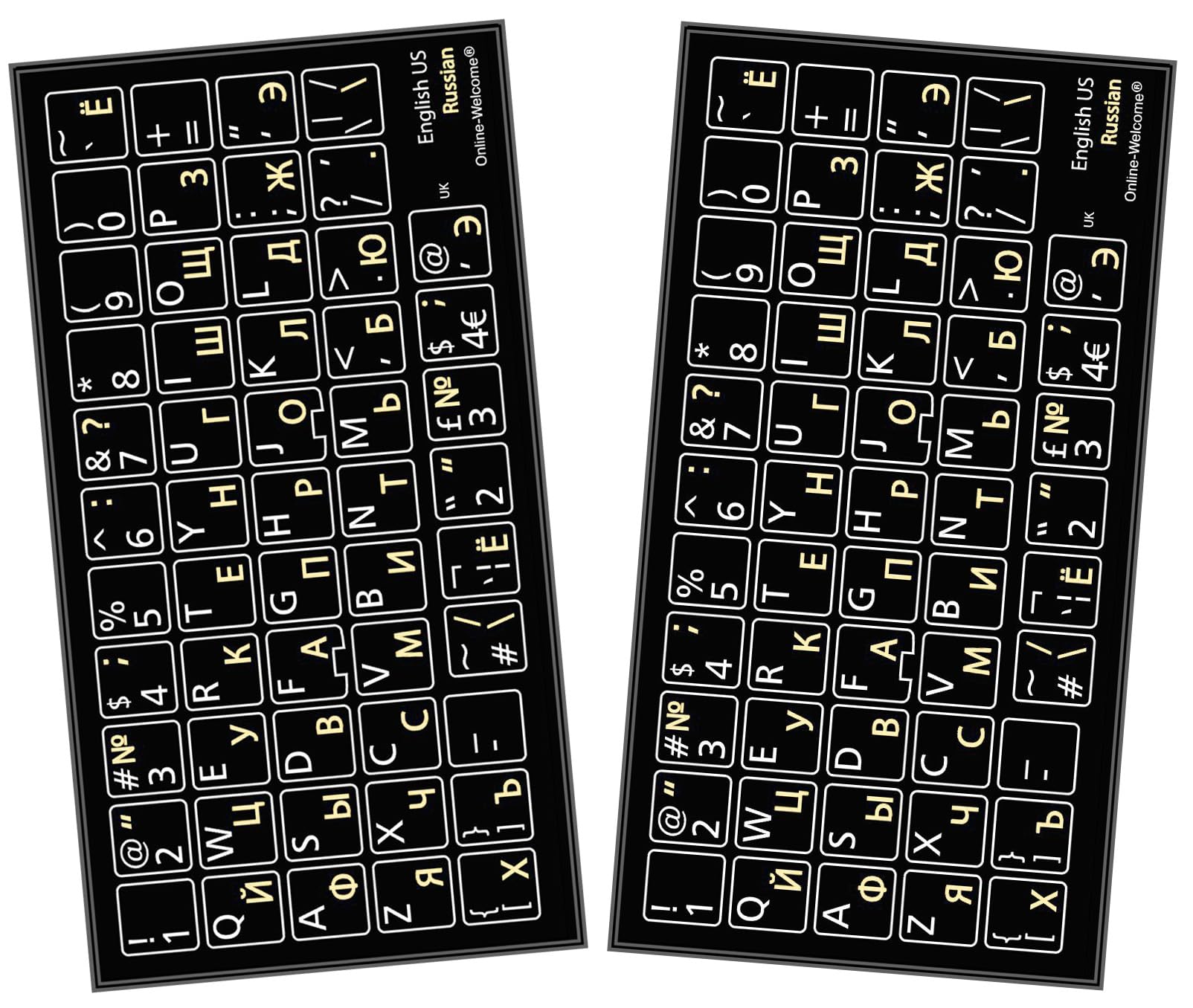 - Russian-English Keyboard stickers 2 Pack Black Background are durable and long lasting . Self-Adhesive keyboard stickers are suitable for variety of keyboards, laptop, Desktop and Notebook. If you wish to remove the stickers, they won't leave residue on the keyboard; any remaining residue can be cleaned with cologne.