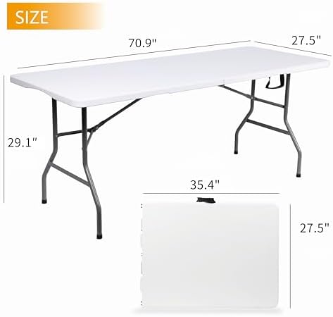 - HEAVY-DUTY CONSTRUCTION & INSTANT SETUP: Built tough with premium HDPE tabletop and powder-coated steel frame - supports up to 300 lbs with confidence. No tools required! Unfolds in seconds from compact 35.4" storage size to full 6-foot workspace. Perfect for busy hosts who need reliable furniture fast.