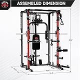 Multi-functional Home Gym Choice - The EVOLPOW M2A POWER CAGE with Smith Machine seamlessly combines a squat rack, POWER CAGEwith Smith Machine, cable pulley system, built in PEC fly machine, multi-grip pull-up bar, and a 360°landmine, this deluxe home gym system offers a total body workout that can greatly improve your exercise efficiency. Perfect for everyone, from beginners to fitness enthusiasts looking to enhance their strength and muscle development! Versatile Chest Training Hub - Featuring a built-in butterfly station, our M2A POWER CAGE with Smith Machine is designed for focused chest workouts, allowing you to sculpt and strengthen your chest muscles with precision. Great for pectoral and rear deltoid, chest, back, and shoulder training for Home Gym. Dual Pulley System fits 3-4 Person One Time - With nylon-coated cable and independent dual pulleys, our rack accommodates up to 3 or 4 users simultaneously. The dual cable pulley system offers flexibility for both unilateral and bilateral exercise routines such as fly, lat pull down, lift up, curl, row. With a 2:1 pulley ratio, it provides seamless motion, extended travel, and improved responsiveness. Stability and Compact Design - Constructed from robust 50x50mm steel tubing and durable 14-gauge steel, the M2A POWER CAGE with Smith Machine exemplifies unmatched strength and longevity. Footprint - 70.1'' H X 74.4'' L X 84.6'' W inch.| Max capacity on J Hook - 1000 lbs.| MaX capacity on Smith Bar - 500 lbs.| Max capacity on Safety Bar - 500lbs.| Max capacity on Pulley System - 800lbs.| Max capacity on Dip Bar - 400 lbs.| Max capacity on Pull-ups Bar - 400 lbs. Suitable for all individuals, from beginners to professional athletes - It provides additional balance support and safety during strength training. Whether you're looking to build strength, recover from an injury, or improve your overall fitness, this product has got you covered. It is perfect for anyone looking to establish a home gym setup and reap the benefits of a versatile and efficient workout routine.