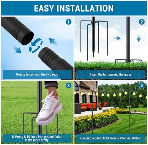 - EASY TO ASSEMBLE - Our backyard light poles for string lights are designed with 3 sections, making them very easy to install. Connect the multiple sections of the light poles in the direction of the threads, then install the ground plugs in the correct order, and you are all set to use. When installing, insert the split end of the bottom rod into the soil. You can complete the installation within 5 minutes