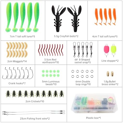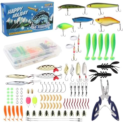Features: Color: Multicolor Quantity: 101 pcs Fish Species: Bass Trout Salmon Walleye Product Description: Product Name: Bass Trout Salmon Walleye Baits Set Holiday Gift Features: Universal Fishing Tackle Set. Designed by seasoned anglers for beginners or professionals, it equips you to target local fish species in freshwater, saltwater, and any other bodies of water. The 101 pcs fishing tackle kit encompasses commonly used bait accessories, including minnow, popper, VIB, pencil, crank, spoons, soft crayfish, maggot, worm soft baits, hooks, brass sinker, swivels, split rings, beads, multifunctional lure plier, tackle box, and more. Premium Fishing Accessories. Crafted from materials such as stainless steel, silicone, and ABS, resistant to deformation. These baits exhibit strong corrosion resistance in seawater and possess exceptional strength, aiding you in catching more fish effortlessly without the worry of losing them. Product List: Hard Lures*15: 10g VIB*1, 9.5g Pencil*1, 15g Minnow*1, 6.8g Popper*1,7.3g Crank lure*1,10g Leaf sequins*2,6.5g Pineapple sequins*2,3g Hook-shaped sequins*2,7.7g Shell sequins*2,6g Spinner sequins*2. Soft lures*46: 7cm T tail soft lures*5, 4cm T tail soft lures*5, 5.5g Crayfish baits*2, 2cm Maggot*14, 2cm Crickets*10, 3.5cm Red earthworm*10. Fishing tackle accessories*40: 5mm Luminous beads*10, 6mm Double loop ring*10, 1.8g Bullet brass sinker*2, Line stopper*2, Crank hook*7, 6# 8-Shaped swivel snap*5, 23cm Fishing front wire*2, Multi functional lure plier*1, Plastic box*1. Product Weight : 349 G / 12.31 Ounces Product Dimensions (L*W*H) : 21.0*11.0*4.0 CM / 8.27*4.33*1.57 Inches Package Weight : 384.0 G / 13.55 Ounces Package Dimensions (L*W*H) : 21.5*12.0*4.3 CM / 8.46*4.72*1.69 Inches Package Include: 1 x 101 pcs Fishing Lures Kit