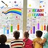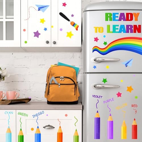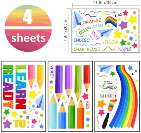 Yovkky Ready to Learn Rainbow Window Clings 4 Sheets, Back to School Colorful Pencil Paper Plane Stickers Decals Kids Nursery Decor, Stars Polka Dots Classroom Bedroom Playroom Home Decorations