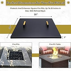 Tough & Reliable: Crafted from sturdy carbon steel fire pit metal lid & our steel fire pit cover offers unbeatable durability, This Fire Pit Insert Square keeps your outdoor moments warm and secure for years to come. All-Weather Protection: This fire pit lids is Heat Resistant Coated & rust-resistant. This firepit insert square shields your fire pit from harsh elements, so you can enjoy hassle-free outdoor gatherings in any season. Embrace Warmth & Comfort: This steel fire pit cover lid is sized at 30" to fit pits up to 28". This outdoor fire pit lid ensures full protection and peace of mind, so nothing interrupts your cozy nights by the fire Comfortable & Sturdy Handles: This square pan lid has wooden handles that are designed for a comfortable grip, making it easy to place and remove the fire pit replacement lid for hassle-free fire pit management. Elevates Every Occasion: The versatile design of the square metal fire pit lid complements various fire pit styles, this outdoor fire pit with lid enhances safety and convenience for all your outdoor gatherings.