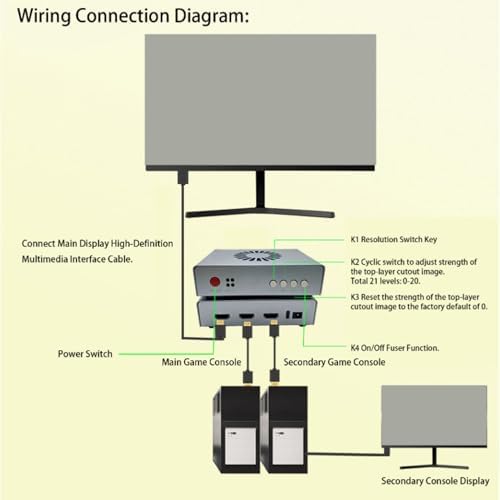Spec: Item Type: DMA Fuser Material: Aluminum alloy Interfaces: HD Multimedia Interface Output: Connect to the main display (primary screen for gaming) HD Multimedia Interface 1 Host: Connect to the host graphics card (computer for gaming) HD Multimedia Interface 2 Sub: Connect to the sub graphics card Type C: Upgrade program and inject EDID DC 12V: Power supply (default 12V 2A) Indicators: D1: Power light (steady on when normal) function on/off indicator light (steady on when function is on, not lit when off) H2: HD Multimedia Interface 2 Sub input signal light (steady on when normal) H1: HD Multimedia Interface 1 Host input signal light (steady on when normal) Key Functions: Power: Power K1: Short press: resolutions in cycles, 1920x1080, 2560x1440, 3840x2160, 2560x1080, 3440x1440, factory default 1920x1080 Long press for three seconds (hold until display): Current resolution and refresh rate displayed in the top left corner of the screen, with host information on top and sub information on the bottom K2: Short press: upper layer extraction strength in cycles, 0 to 20 levels in total, factory default 0 (0 for no extraction) K3: Short press: restore upper layer extraction strength to factory default 0 K4: Short press: on/off function How to Use: Refer to the instruction manual for details Package List: 1 x DMA Fuser 1 x Supply Cord 1 x USB Cable 1 x User Manual