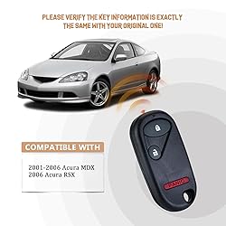 - The High-Quality Affordable Brand New Proximity KeyWe provide you with brand new replacement for select vehicles, remote comes with a battery already installed in the device.We test every single remote before we send it to make sure it is transmitting and functioning just like the original one.Keep in mind: The original key must have EXACTLY the same buttons, for it to work.Compatible with: 2001-2006 Acu-ra MDX 2006 Acu-ra RSXReplacement for FCC ID: E4EG8D-444H-A Frequency: 308MHZ Note:Please make sure the remote programming works for your vehicle before getting it cut or programmed in case of any loss.