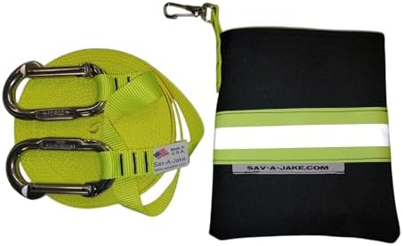 Sav-A-Jake International's Hurricane Primary Search Pack is made with 35 feet of 4000 lb. nylon webbing and 2 non locking carabiners sewn into each end. The special Hurricane wrap of the webbing allows for quick deployment of the webbing search line. The included pouch seals shut with industrial strength Velcro for a secure closure. It also has 2" wide 3M yellow reflective striping for easy visibility. The pack fits easily into a bunker pants pocket or can remain outside the pocket and attached to a bunker coat or airpack. The carabiners can be stored inside or outside the pouch (see photos). Includes 35 feet of 4000 lb. strength NYLON webbing, 2 non-locking carabiners, and an 8"x7"x1" pouch. The pouch has a sewn in clip for easy attachment to your gear.