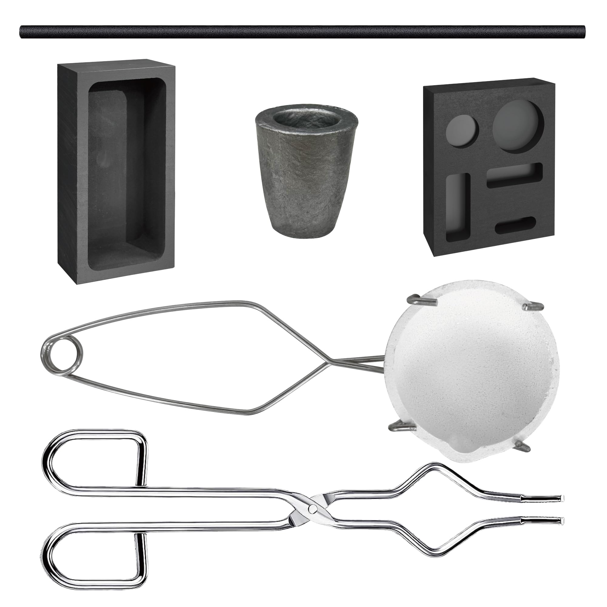 - All-in-One Crucible Kit for Gold Refining – This 8-in-1 set is your complete solution for refining gold and other precious metals. Includes 1 5-in-1 ingot mold, 1 1kg ingot mold, 2 graphite stirring rods, 1 quartz cup, 1 graphite crucible, 2 crucible tongs