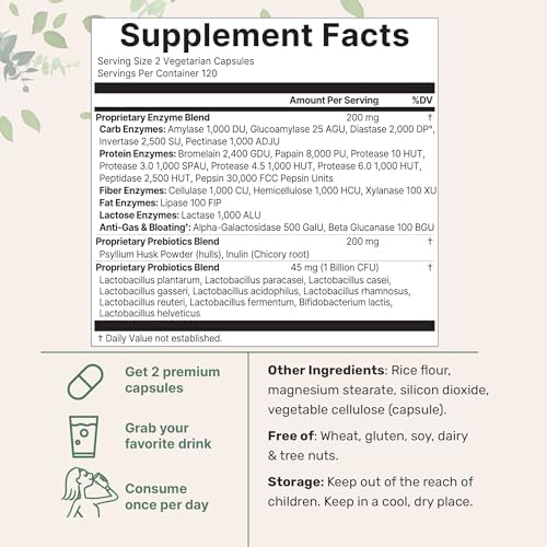 - Each bottle contains 240 natural vegetarian capsules. An all-in-one formula that includes a diverse blend of Amylase, Papain, Bromelain, Psyllium Husk, Inulin, Lactobacillus, Bifidobacterium and more.