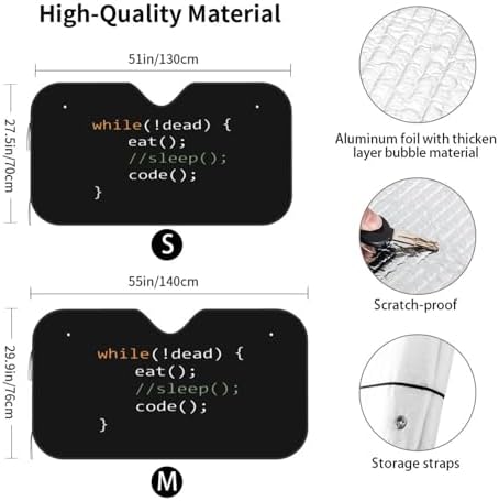 Size 51.2" X 27.5" And M: 55" X 30". The Two Sizes Are Perfect For The Windshield Of Most Models.Using Waterproof Polyester Fabric + Bubble Aluminum Film, Good Heat Insulation Effect, Can Effectively Shield Your Car From The Sun,The Recessed End Is Upward, And Two Suction Cups Are Used To Suck The Windshield Through The Corns. Please Check The Size Of Your Windshield To Make Sure It Fits.Easy Setup & Store: Folding Design And Easy To Install And Uninstall, Making It Convenient For Daily Use. Just Place It Under The Windshield And Use The Suction Cups To Hold The Shade Firmly.The Recessed End Is Upward, And Two Suction Cups Are Used To Suck The Windshield Through The Corns. Please Check The Size Of Your Windshield To Make Sure It Fits.This Is A Great Gift For Your Family And Friends, And I Believe They Will Love It