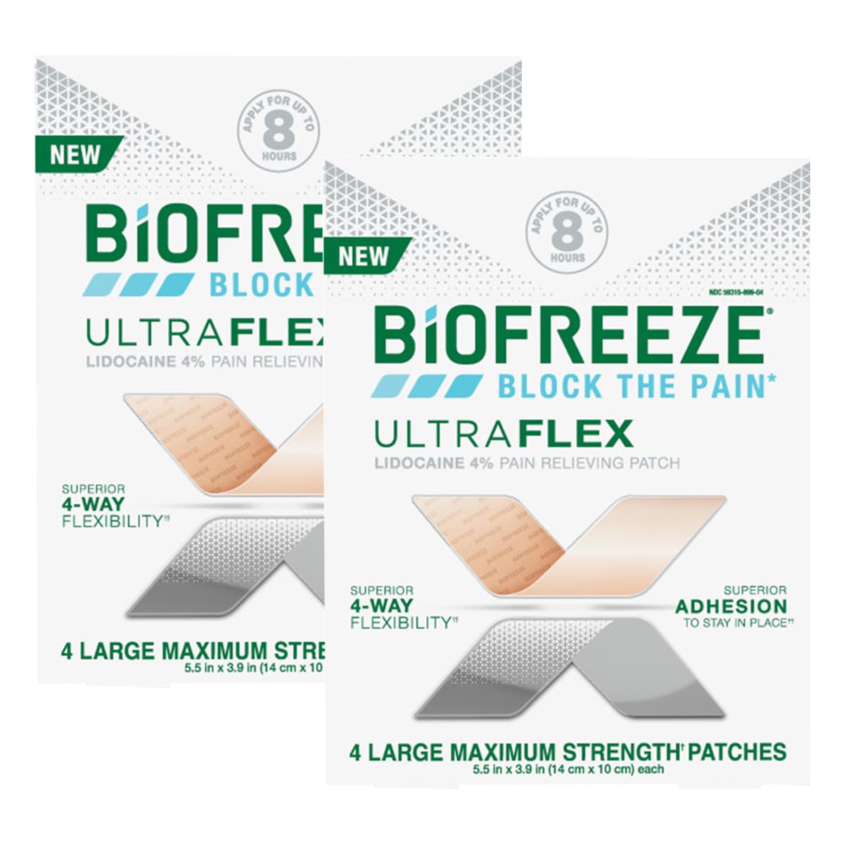 Biofreeze UltraFlex Lidocaine Patches Maximum Strength, Patented Technology, Flexible Pain Relief Patch for Lower Back, Lidocaine Patch for Neck, Knee, Shoulder, Large Patches, 4 Count (Pack of 2)