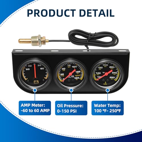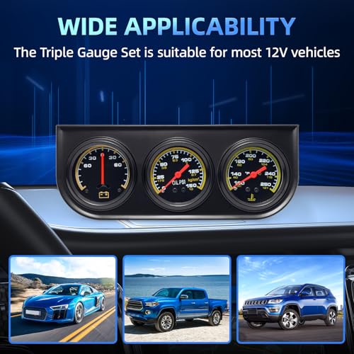 - Easy Installation & Universal Fit: Oil pressure Water temperature and Ammeter designed for 12V vehicles, this 3 gauge cluster kit is easy to install and suitable for most 12V cars, trucks