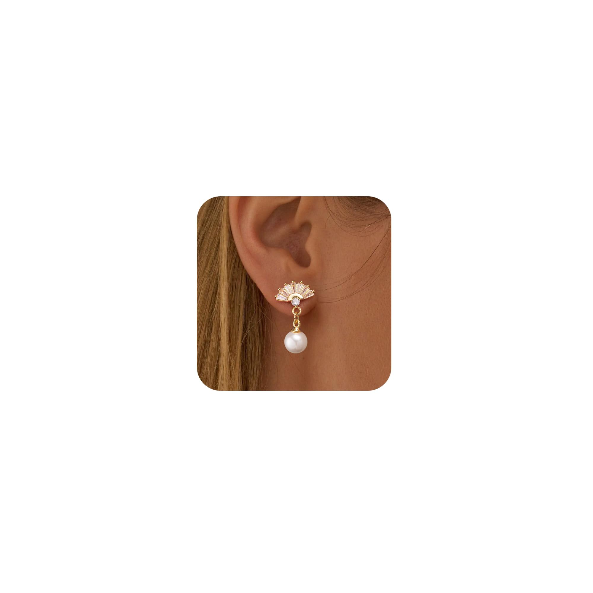 HANLI Pearl Dangle Earrings for Women - 14K Gold Plated Dainty Cubic Zirconia Pearl Drop Wedding Stud Earrings for Brides Bridal Jewelry
