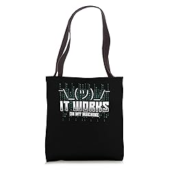 It Works On My Machine This funny it works on my machine design is perfect for a coding programmer, software developer or anyone who loves programming 16” x 16” bag with two 14” long and 1” wide black cotton webbing strap handles. Made of a lightweight, spun polyester canvas-like fabric. All seams and stress points are double-stitched for durability, and the reinforced bottom flattens to fit more items and hold larger objects. Spot clean/dry clean only.