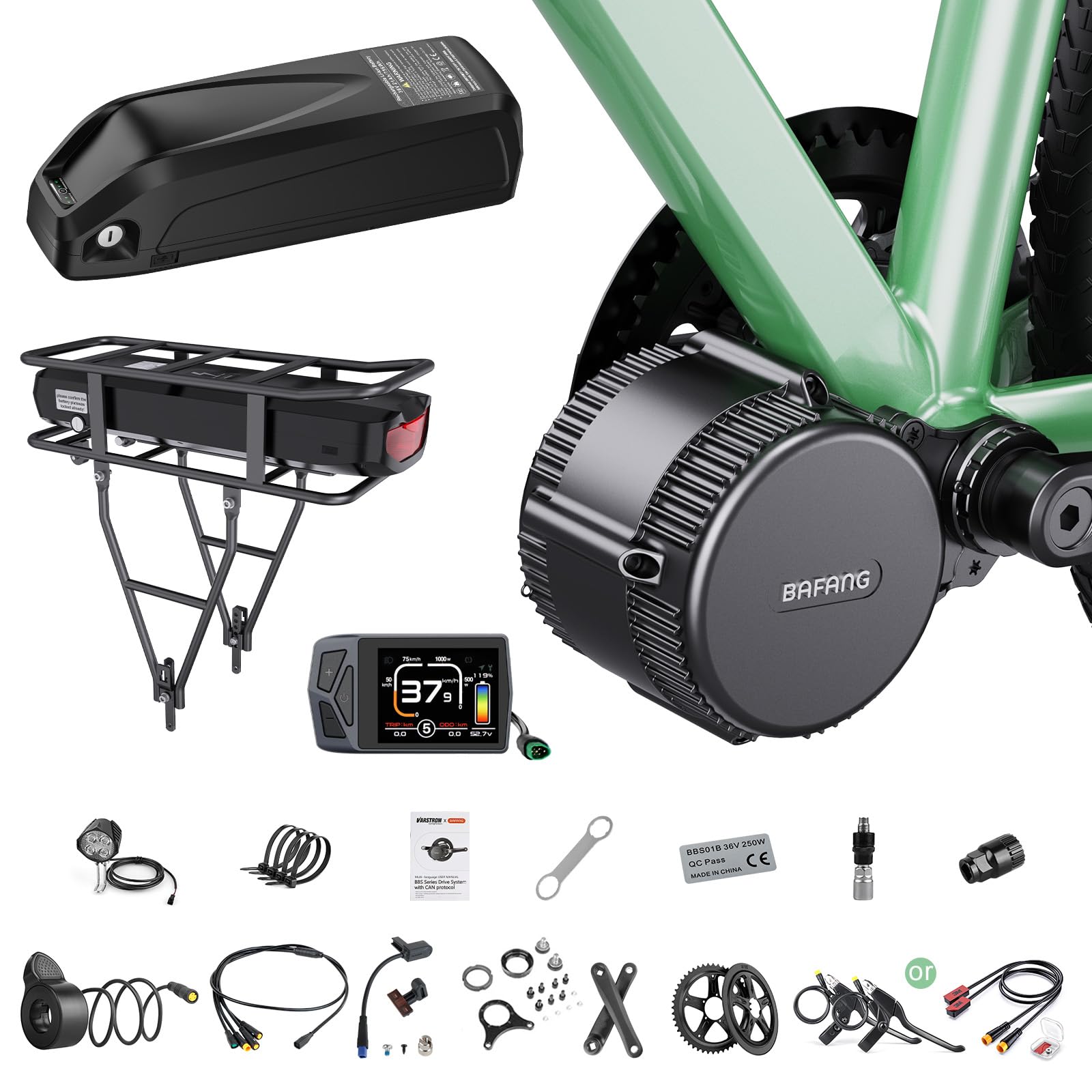 - Powerful CAN BUS Mid Drive Motor Kit: BAFANG Mid Drive Motor Choose from 500W with 100 N.m torque, 750W with 120 N.m torque, up to 1000W with 160 N.m torque. , this upgraded ebike conversion kit has upgraded current output stability, upgraded dual Hall speed sensors, battery communication function (need to be matched with a battery with communication function), and added taillight cable (with brake light function), providing better riding performance and experience