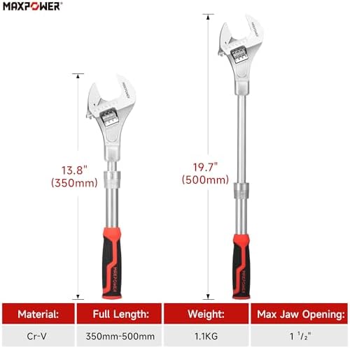 MAXPOWER Extendable Adjustable Wrench, Retractable Extension Shank 13.8" to 19.7", Soft Grip Handle