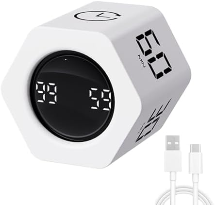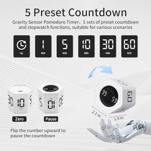 Productivity Timer Flip Gravity Sensor Pomodoro Cube Timer Countdown & Countup,1/5/10/30/60min Preset & Custom Timing, Mute/Vibrate/Sound for ADHD,Work,Study,Kitchen(1, White Hexagon)