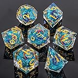 Roycevon Dragon Pattern Liquid Core DND Dice Set, 7Pcs Sharp Edge Dice with Gift Box, Resin Blue Dungeons Dragons D and D Role Playing Dice D20 D12 D10 D8 D6 D4