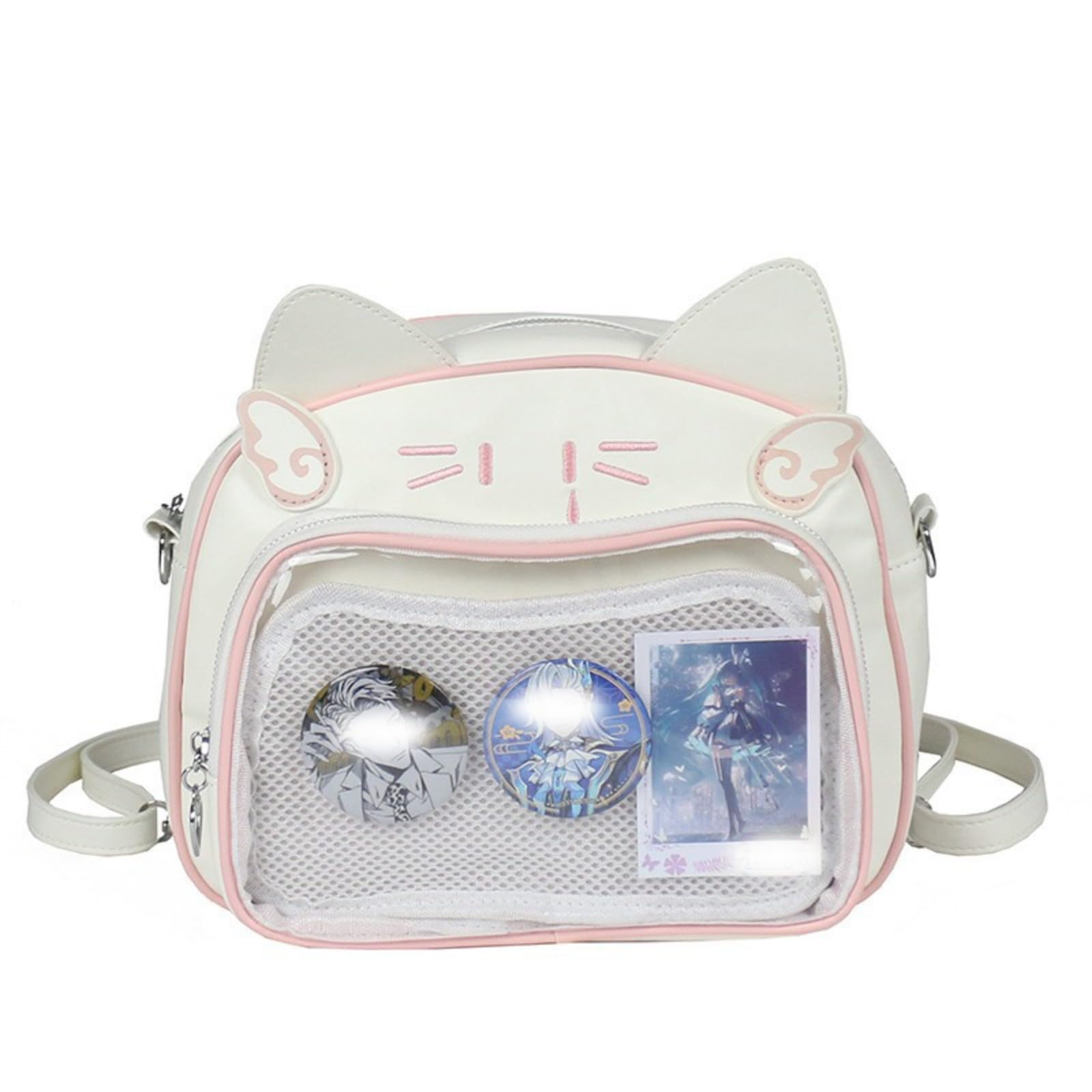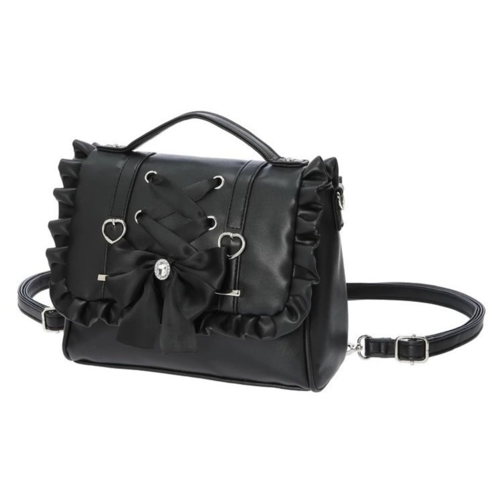 - Unique Design Description: This mini faux leather backpack combines a playful kawaii aesthetic with a modern twist, featuring a bow accent with a gem buckle and cute cat ear detailing; the ruffled design adds a touch of charm