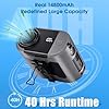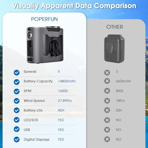 - 【Designed for Outdoor Workers】Featuring a ultra-long battery life engineered specifically for outdoor scenarios with a 14800mAh battery. The 1st speed mode delivers 40 hours of continuous cooling for all-day comfort, while the 5th turbo mode provides powerful airflow to combat extreme heat. Integrated with a LED display screen for real-time energy monitoring, empowering construction workers and camping enthusiasts to eliminate power outage concerns and maintain cool control anytime, anywhere.