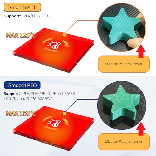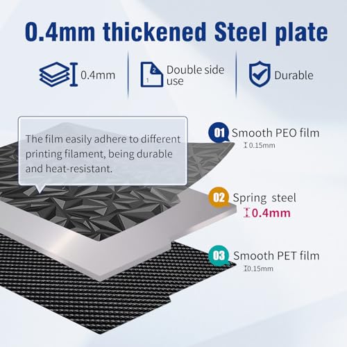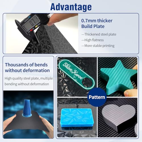 【Product Features】:The side of PEO can display large diamond patterns without color conversion, maintaining its own filament color, which is more atmospheric and dignified; The PET side displays a pattern similar to carbon fiber, without converting colors. This pattern is very rational and regular, making the printed surface neat and regular.we use a 0.4mm thick stainless steel plate that is resistant to deformation and rust. With high flatness and ample toughness, it provides strong adhesion, making it extremely user-friendly. We have extensively tested and verified the results on various machines.