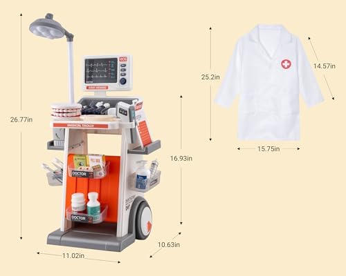 - Even young babies can push the stroller steadily + convenient and durable: This doctor's set uses sturdy and safe ABS material to make the stroller, with multi-layer storage shelves that are convenient for sorting and storing accessories and are not easy to tip over. Its wheels can be easily pulled, helping children play medical games anytime, anywhere.