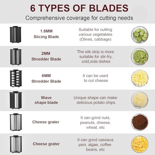 - 6-in-1 Electric Cheese Grater: This electric cheese grater comes with 6 different blades to meet all your shredding and slicing needs. The blades include fine shred, coarse shred, wavy slice, slicing, fine grind, and coarse grind.