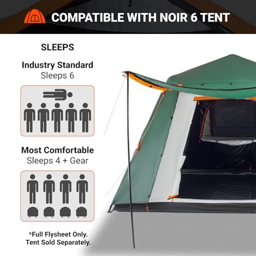 - BUILT IN AWNING: In addition to boosting comfort inside, the Noir 6 large tent cover features a built-in awning for added sheltered space for cooking, lounging, or storing camping supplies.