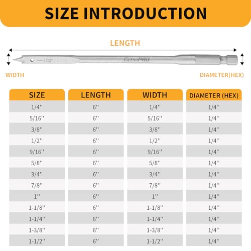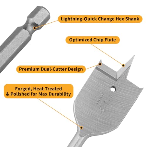 13-Piece Spade Drill Bit Set, Paddle Flat Bits for Woodworking, 1/4" to 1-1/2", Quick Change Hex Shank, Nylon Storage Pouch Included