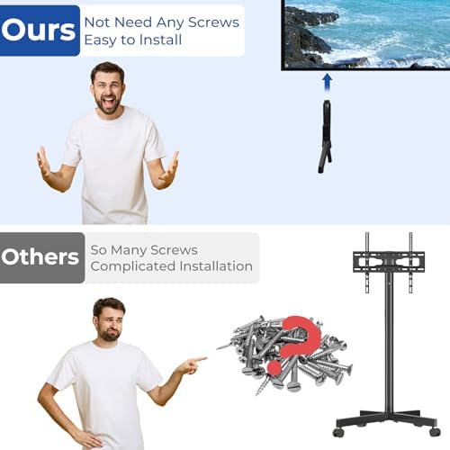- Quick & Easy Assembly: No screws needed, no more go out searching for screws or complicated instructions. Just lay down your TV first and then follow the mark sign "L" and "R" to put the tv legs inside your TV bottom. 2 steps in 3 minutes, you can finish the installation by yourself without any hassle. Say goodbye to the frustration of complex installations.