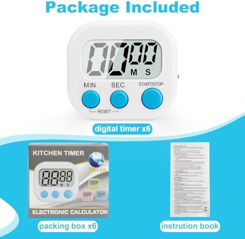 - Package Included: You will receive 6 pack digital timers including 2 pcs white timers, 2pcs blue timers, 1pcs pink timer and 1 pcs green timer, measuring about 2.76x2.36 inch/7x6 cm. Package includes instrution book which makes your use easier. Enough quanity and various color can meet your diverse daily demand. This kitchen timer is suitable for cooking, study, exercise, meeting and more. Note: Battery are not included