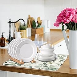 Green Leaf Dish Drying Mat: Directly introducing natural elements into the interior injects an eternal freshness into modern living spaces, creating a comfortable feeling of "seclusion in the city". It can also alleviate visual fatigue during use Strong Absorption: The drying mat are made of absorbent microfiber, offering exceptional absorbency. The non-slip backing prevents the mat from sliding. You can directly place the pot, plate, and cleaned fruits on the mat to dry Perfect Size: The kitchen super absorbent draining mat size is 18 "x24", accommodating kitchen utensils of various sizes. Keep your kitchen countertops dry and tidy at all times Easy to Store: This dish pads for drying can be folded and placed in drawers or cabinets when not in use, and can also be hung on hooks with the included straps. This dish drain mat is also easy to clean, just wipe or rinse to keep it clean Multi Functional: This sink drying mat is versatile and can be used for countertops in kitchens, living rooms, bathrooms, offices, and more. It can also be used as a coffee machine mat, bar mat, pet feeding mat, etc