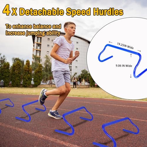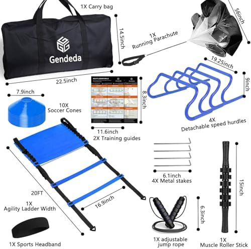 - Agility Training Equipment Set : Includes 20-foot agility ladder, 4 Agility hurdles, 1 Running Parachute,10 disc Soccer Cones, and More. Perfect for pros, beginners, kids, and anyone looking to improve speed, agility, and coordination.