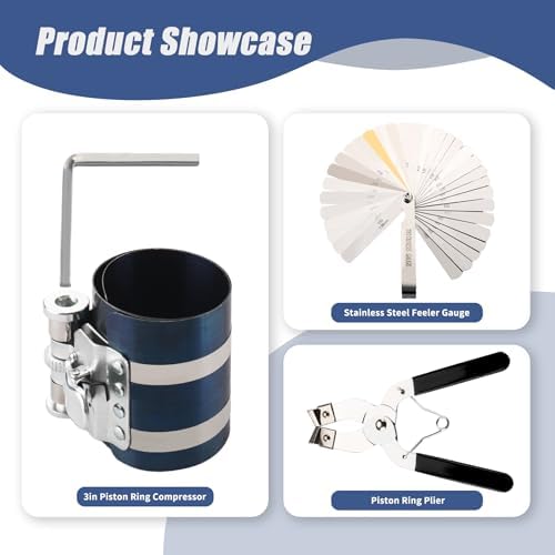 - Product Includes: 1 x 3 in. Piston Ring Compressor, 1 x Piston Ring Plier,1x Stainless Steel Feeler Gauge, 1 x Wrench
