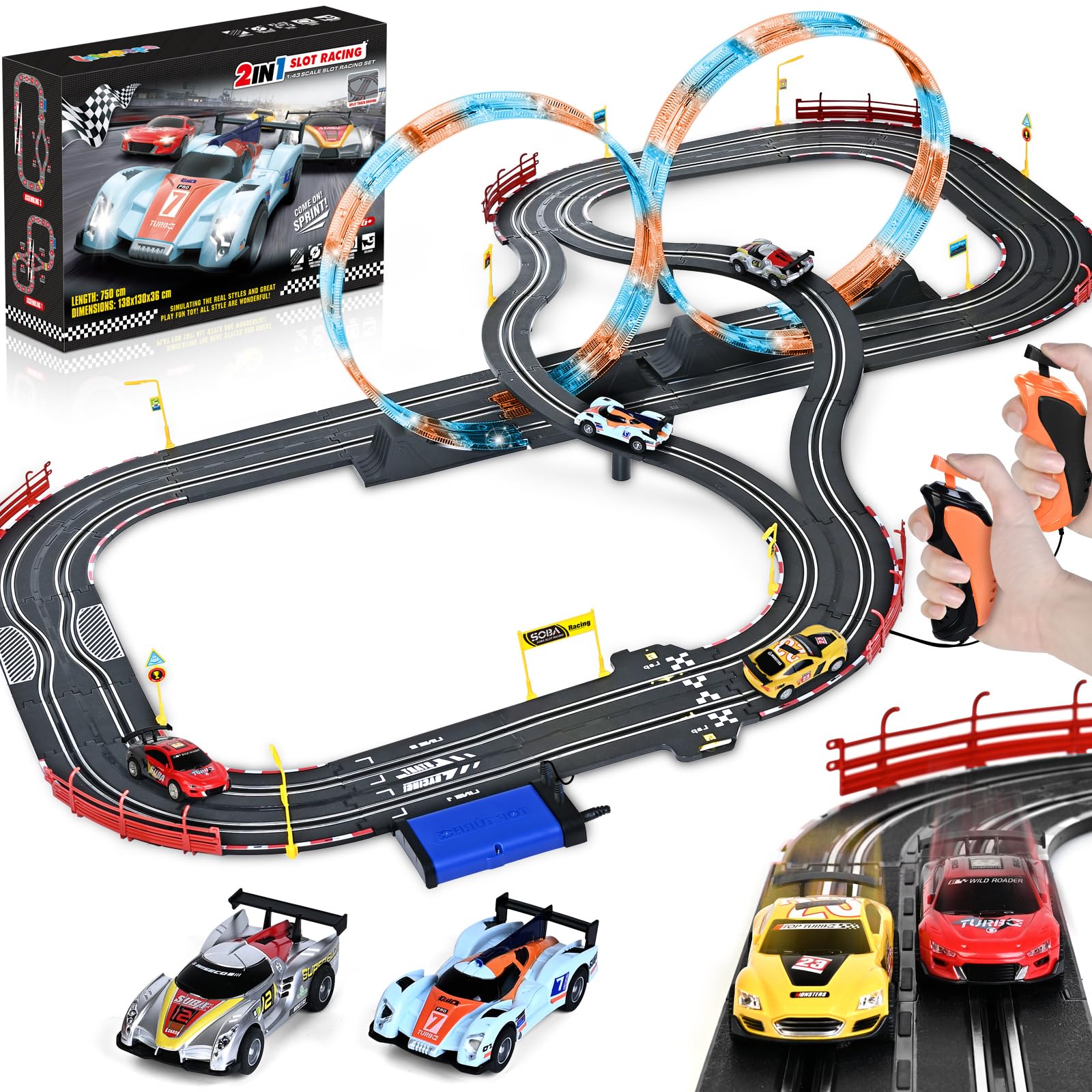 - 【Cool Race Track】This slot car race track sets have integrated various racing terrains including straight tracks, 360° circular tracks, slope curves and double-level overpass tracks, bringing kids more realistic game experience. Equipped with the automatic lap counting function, race car track can record the race results in real time, allowing the racers to concenrate on the competition.
