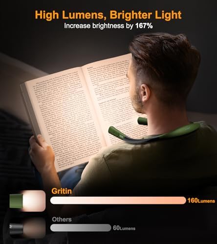 Gritin Book Light, Rechargeable Neck Light for Reading - 4-Color&5-Brightness,Bendable Arms,30-min Timer,80+ Hrs Runtime,Neck Curve Fit Ergonomic Design, Comfortable for Reading,Camping,Repairing etc.