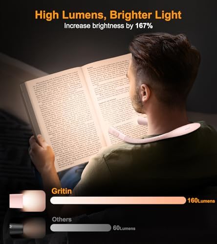 Gritin Book Light, Rechargeable Neck Light for Reading - 4-Color&5-Brightness,Bendable Arms,30-min Timer,80+ Hrs Runtime,Neck Curve Fit Ergonomic Design, Comfortable for Reading,Camping,Repairing etc.