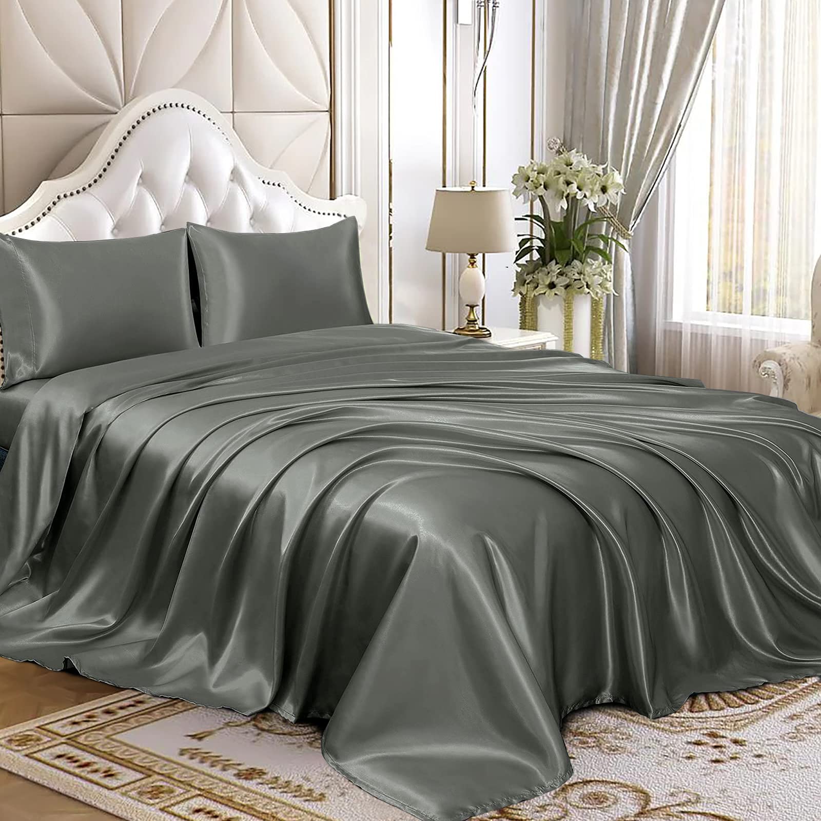 Luxury Silky Cooling Bed Sheet Set -- Made of 100 percent rayon derived from bamboo fabric, you can enjoy sleep every night with these awesome sheets set -- Multi colors and size can redesign your bedroom, ready to send you off into the most peaceful dream-state ever with the silky comfy feeling Deep Pocket Design These sheets grip and fit better than any other sheet set -- Deep pockets that fit mattresses up to 16" deep with elastic around the fitted sheet Available Colors Granite Blue, White, Navy Blue, Black, Light Gray, Beige, Sage Green, Dark Grey Available Size Twin Size Sheets: 1 Flat Sheet: 66" x 96"; 1 Fitted Sheet : 39" x 75" + 16"; 1 Pillowcase: 20" x 30" Full Size Sheets: 1 Flat Sheet: 81" x 96"; 1 Fitted Sheet: 54" x 75" + 16"; 2 Pillowcases: 20" x 30" Queen Size Sheets: 1 Flat Sheet: 90" x 102"; 1 Fitted Sheet: 60" x 80" + 16"; 2 Pillowcases: 20" x 30" King Size Sheets: 1 Flat Sheet: 108" x 102"; 1 Fitted Sheet: 78" x 80" + 16"; 2 Pillowcases: 20" x 40"