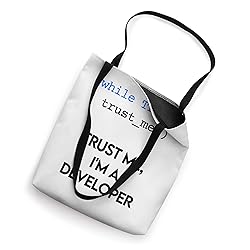 Showcase your developer coding pride with this Trust Me, I'm a Developer design. Perfect for programmers, this funny coding idea highlights your expertise. An essential addition for any coder, blending humor and coding passion seamlessly Embrace your coding skills with this Trust Me, I'm a Developer design. Ideal for programmers, this funny coding idea combines developer humor with coding flair. A must-have for any developer, reflecting dedication to programming. Trust Me, I'm a Developer 16” x 16” bag with two 14” long and 1” wide black cotton webbing strap handles. Made of a lightweight, spun polyester canvas-like fabric. All seams and stress points are double-stitched for durability, and the reinforced bottom flattens to fit more items and hold larger objects. Spot clean/dry clean only.